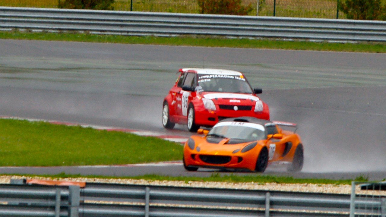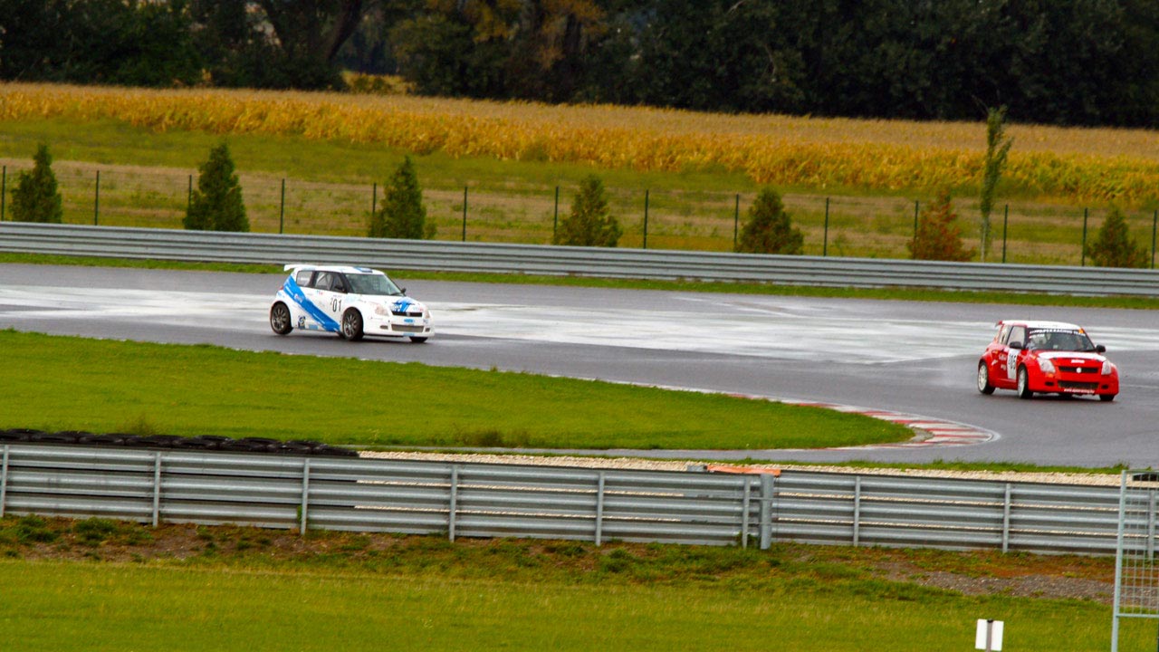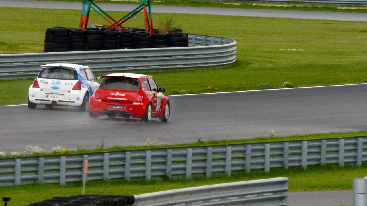 Még a rajtrácsra menet elállt az eső, de a pályán állt a víz. A kérdés az volt, maradjunk a slick-en, vagy cseréljünk esős gumira. Az 1600cc-es kategóriát vezető Mohácsi Ákos gumicsere mellett döntött, és a boxból rajtolt, így mi úgy döntöttünk, hogy az ellenkezőét tesszük. Azaz maradtunk a slick-eken, bízva abban, hogy a pálya felszárad.